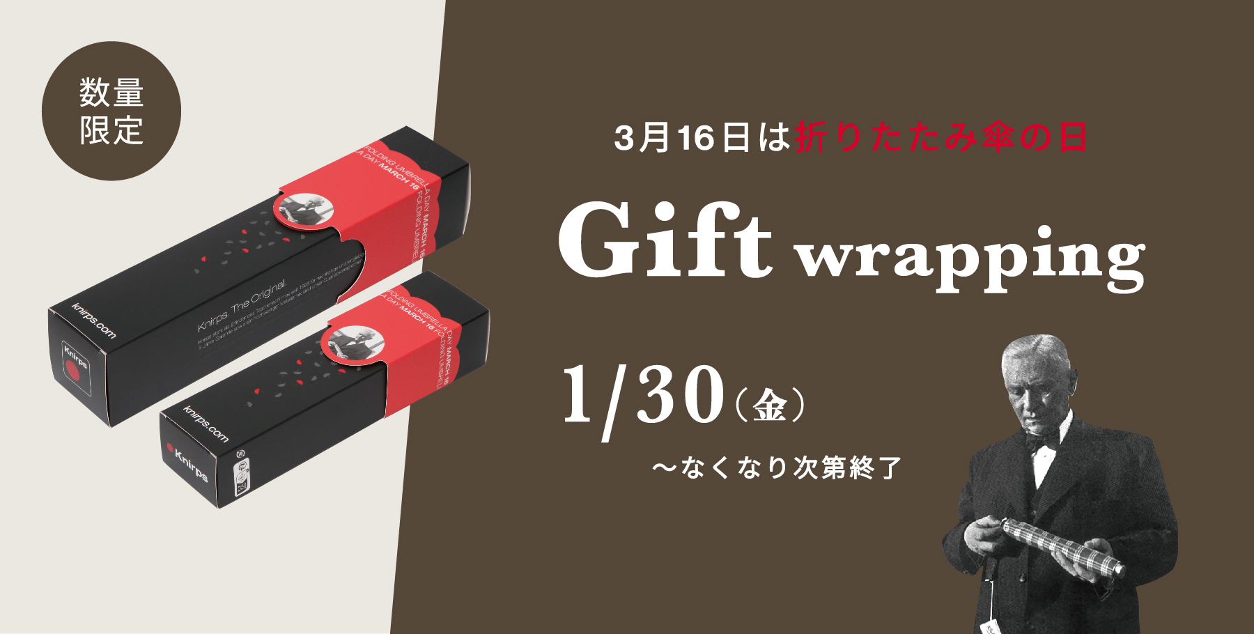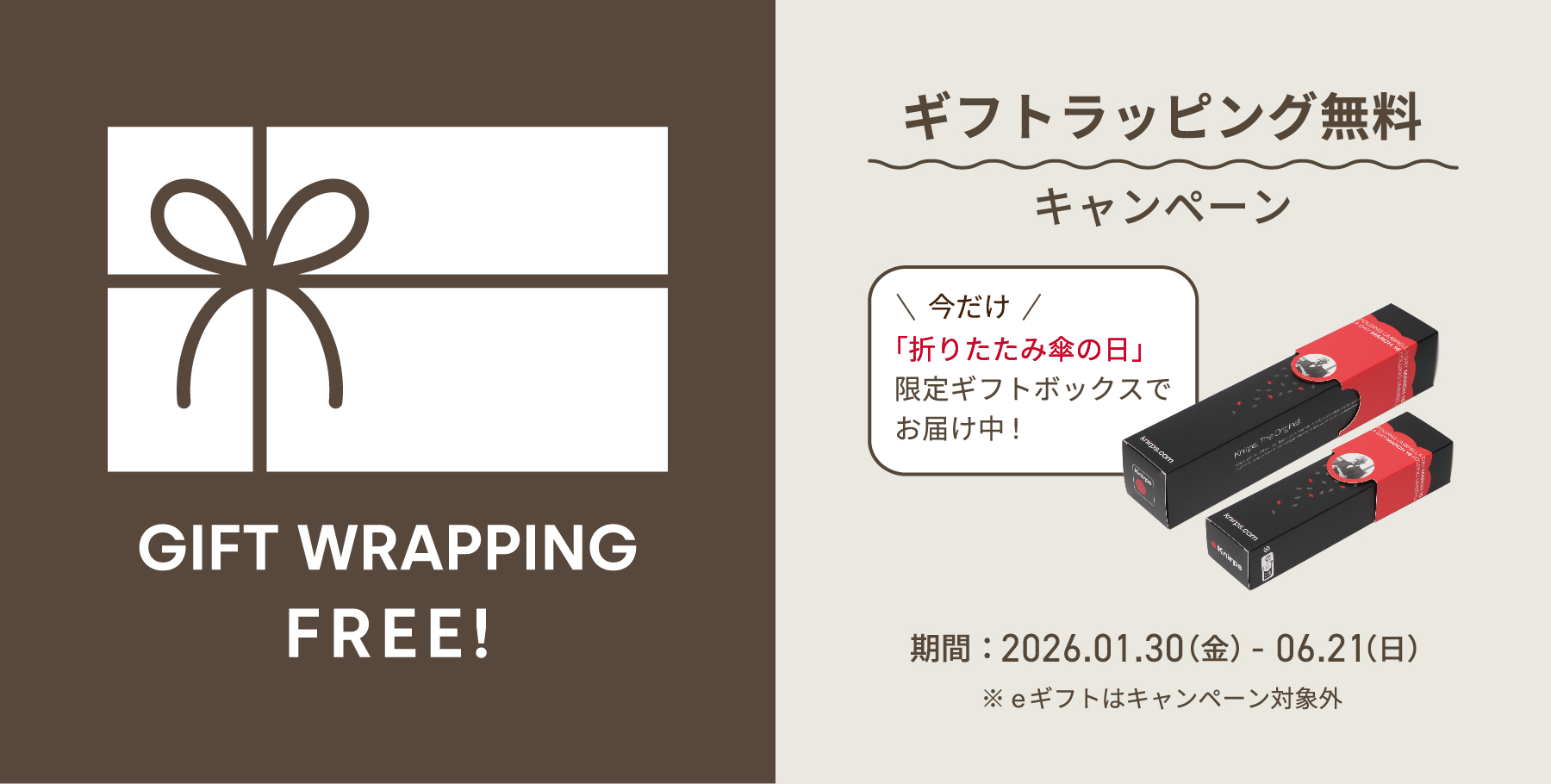 いつもクニルプス日本公式オンラインストアをご利用いただき誠にありがとうございます。 下記の通り、ラッピング無料キャンペーンを開催いたします。 開催期間 2026年1月30日(金)~2026年6月21日(日) 通常は1箱につき220円(税込)のところ、期間限定で無料となります。 今だけ「3月16日は折りたたみ傘の日」を記念し…